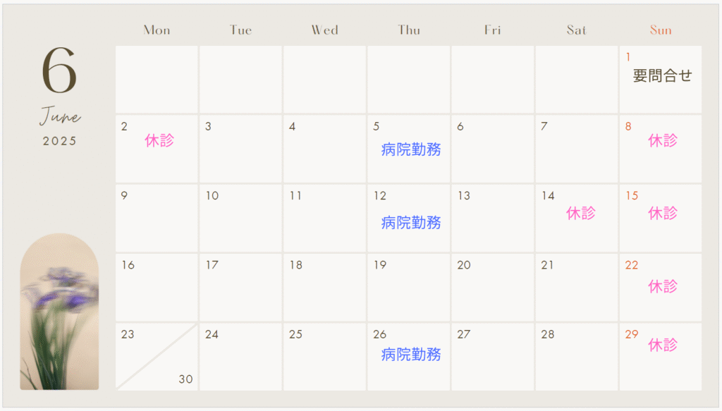 空白は診療受付日となります。ご不明な点や、日時につきましては、まずはご相談いただけましたら調整させていただきたいと思います。どうぞよろしくお願いいたします☺